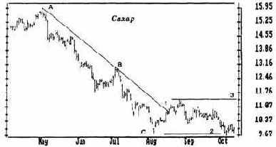 Чем больше число соприкосновений цен с линией тренда, тем она надежнее. При восходящем тренде, возврат к линии означает восстание среди "медведей". При нисходящем тренде подскок цен до линии означает восстание "быков". Когда цены доходят до линии тренда к затем движутся обратно, вы знаете, что доминирующая на рынке группа победила восставших.