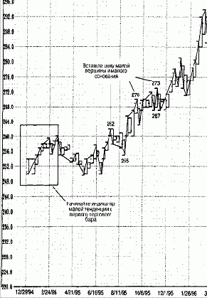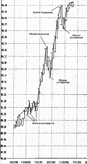 ка. Если, оттолкнувшись от минимальной цены, рынок образовал локальный наибольший максимум, то используйте зеленую ручку для проведения линии малой тенденции вверх от минимума, который был зафиксирован одним баром раньше, до максимума текущего бара. Тогда минимум, что был один бар назад, становится малым основанием. Каждую неделю, когда рынок образует последующий наибольший максимум, продолжайте вести линию малой тенденции наверх, к достигнутой рынком максимальной цене. Продолжайте вести линию малой тенденции от максимума к максимуму, пока рынок не образует локальный наименьший минимум. В этом случае используйте красную ручку для нанесения линии малой тенденции вниз, ведя ее от одного бара позади максимума, к минимуму текущего бара. Тогда максимум, который находится на предыдущем баре, становится малой вершиной. Каждую неделю, когда рынок образует последующий наименьший минимум, продолжайте вести линию малой тенденции вниз, к достигнутой рынком минимальной цене. Продолжайте вести линию малой тенденции от минимума к минимуму до тех пор, пока рынок не образует наивысший максимум.